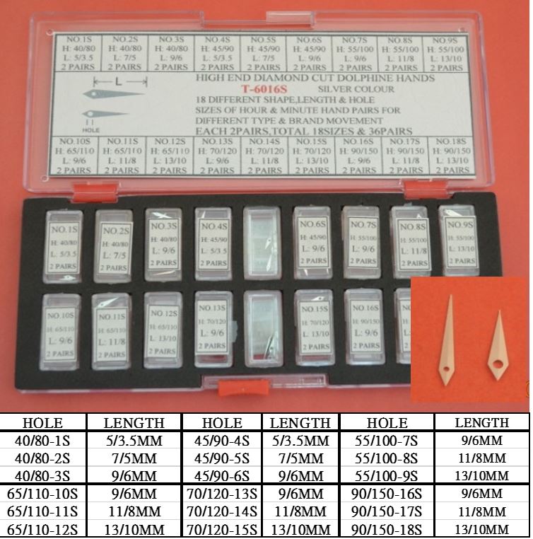 PNP High End Diamond Cut DAUPHIN Hour & Minute Pair Hands, Different Hole Sizes & Diff. Length In 18 Sets Each 2 Pairs & Total 36 Pairs For Different Type & Brand Movement