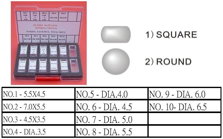2-Different Style Date Lens, 7 Round Dia. 3.5, 4.0, 4.5, 5.0, 5.5, 6.0 & 6.5mm, 3 Square 5.5X4.5, 7.0X5.5, 4.5X3.5mm, Each 5Pcs, Total 10 Sizes And 50Pcs