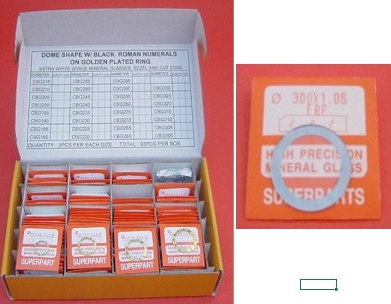 Glass Kit, Minerial, Dome Round, Polished With Silver Ring Printing, Thickness 1.0 mm, Diameter 18.0-33.0 mm 0.5 mm Increment, 5 Pcs/Size, Total 155 Pcs