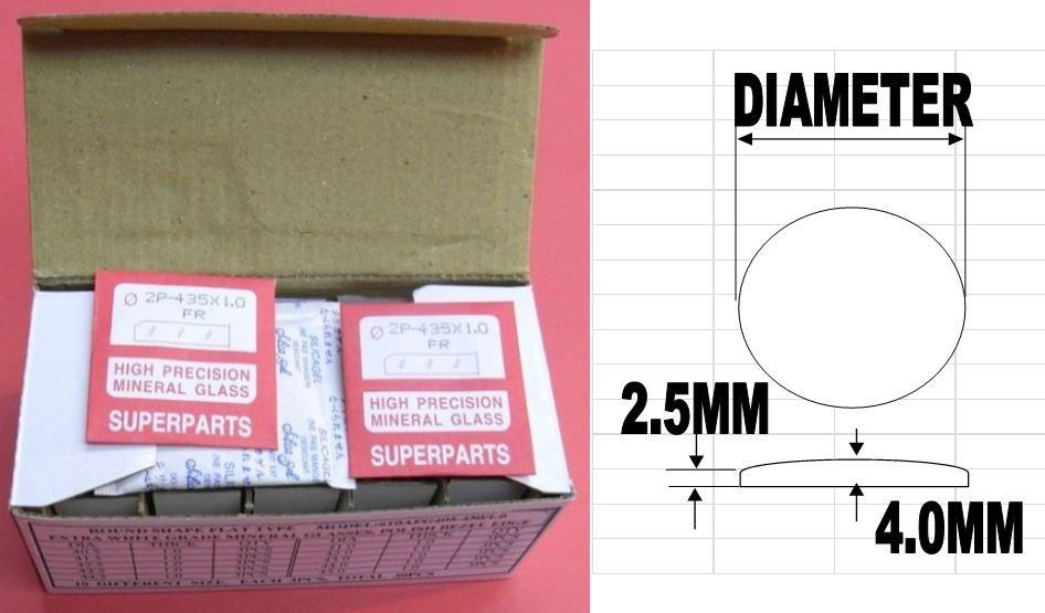 Glass Kit, Minerial, Single Dome Round, Polished, Edge Height 2.5 mm Center Height 4.0 mm, Diameter 38.5-43.0 mm 0.5 mm Increment, 2 Pcs/Size, Total 20 Pcs
